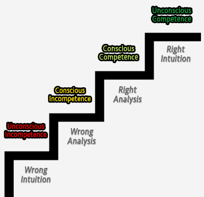 After a couple of games, he starts to get it and as he's completing passes and winning games, he's feeling good about himself (conscious competence). Then he gets to a tough, 2-minute drill to lead his team to victory. He's calling audibles at the line because at a glimpse he's diagnosing what defense he'll see each play. He's executing each play, running back to the line of scrimmage, and driving his team down the field (unconscious competence).